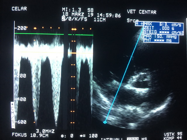 Povišenje plućnog pritiska, koje predhodi slabosti srca, može se na vreme uočiti kompetentnim ultrazvučnim pregledom. Zbog toga su neophodne kardiološke kontrole svih pacijenata inficiranih ovim parazitom, bez obzira na početni stadijum bolesti i bez obzira na primenjeni način lečenja (slika 6).