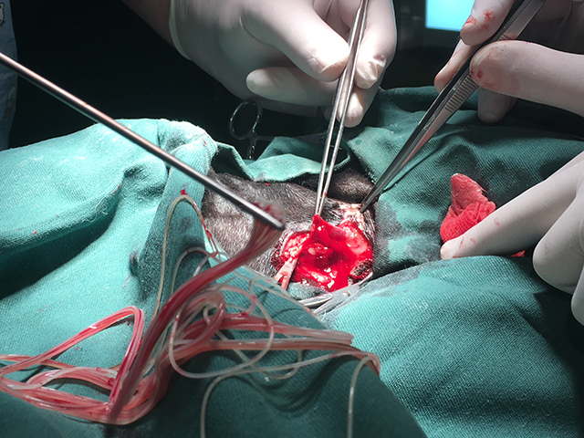 Trenutno je nemoguće u našem regionu izvršiti hirurško uklanjanje crva iz plućnih arterija. Međutim, možemo uraditi hiruršku intervenciju u slučaju tzv. sindroma vene kave, kada se, što je posebno čest slučaj kod malih pasa, klupko crva nalazi u desnoj predkomori i komori (slika 5).